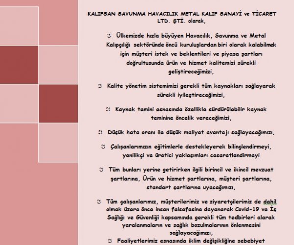 Kalıpsan Savunma Havacılık Metal Kalıp Sanayi ve TİC.LTD. ŞTİ. meslek hayatına 1984 yılında sac metal kalıpçılığı ve eksantrik pres baskı işleri ile başlamıştır. 40 yıla yakın mesleki tecrübesi ile değişen teknolojiyi takip ederek, elektrik, enerji, otomotiv, beyaz eşya ve savunma sanayine hizmet vermektedir. Her geçen gün kendi yatırımları ile değişen ve gelişen teknolojiye ayak uydurma gayreti içerisinde olan Kalıpsan Savunma Havacılık, kalite anlayışı ve müşteri memnuniyetini ön planda tutarak çalışmalarına devam etmektedir. Kalite anlayışını sürekli yenileyen ve geliştiren Kalıpsan Savunma Havacılık, uzun bir süre önce edindiği ISO 9001:2008 kalite yönetim sistemini, sürekli iyileştirerek kurumsal bir yapı oluşturma planını istikrarlı bir şekilde, tüm teknolojik imkânlarını kul